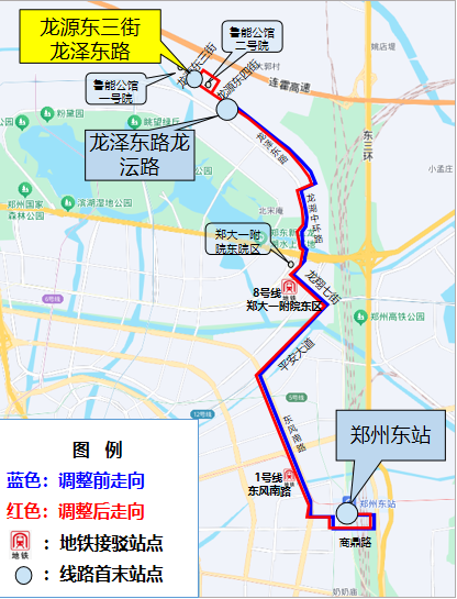 調整S132路首末站調整為:鄭州東站—龍源東三街龍澤東路途經(jīng)道路調整為:東三環(huán)、商鼎路、心怡路、東站南街、東風南路、東風東路、平安大道、龍翔七街、龍湖中環(huán)路、育翔路、龍澤東路、龍源東三街、龍湖外環(huán)北路、龍源東四街。