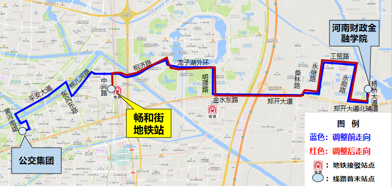 調整312路首末站調整為:河南財政金融學院—暢和街站途經(jīng)道路調整為:楊橋大道、鄭開大道北輔道、永順路、工貿(mào)路、永繼路、鄭開大道北輔道、桑林路、鄭開大道、金水東路、明理路、龍子湖外環(huán)、相濟路、中興路。