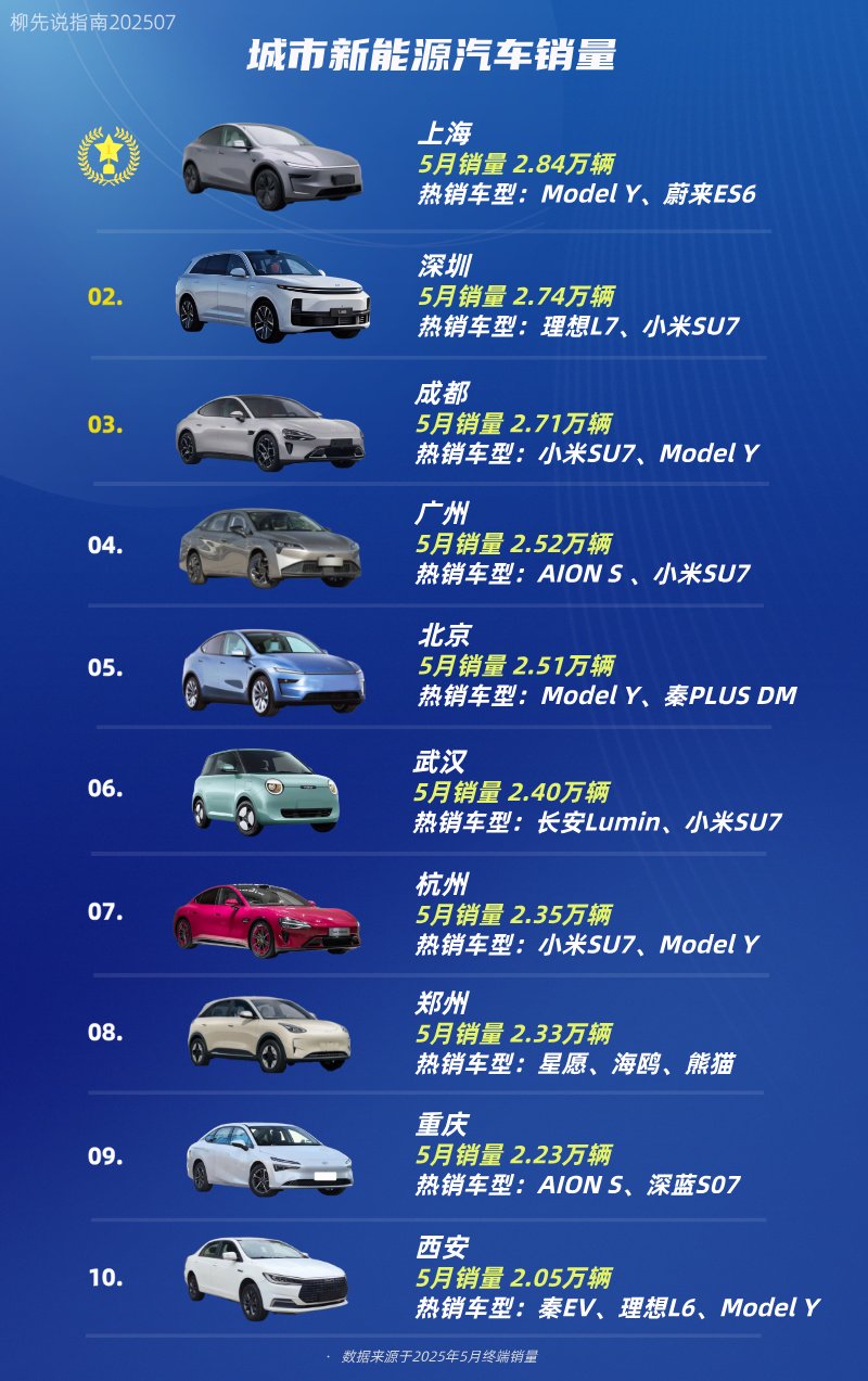 城市新能源汽車銷量2025年5月,城市新能源汽車銷量6-10名:武漢、杭州、鄭州、重慶以及西安湖北武漢排名第6,新能源汽車月銷量達2.4萬輛,當地熱銷車型有長安Lumin(配置|詢價)、小米SU7(配置。