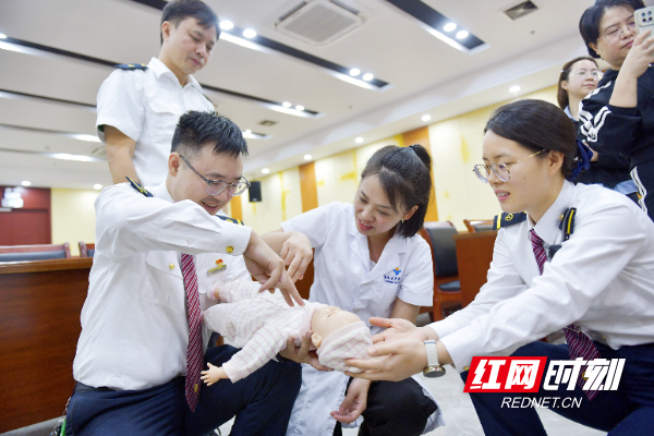 在醫護人員指導下,車站工作人員現場進行海姆立克急救法訓練 長沙南車站黨委委員、工會主席李鎂銘在致辭中表示,高鐵站作為人流密集的公共場所,提升一線員工的急救能力和心理素質,是保障旅客安全、優化服務品質的關鍵舉措。