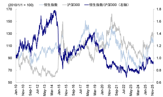 3) 周期:近期強周期尤其是有色板塊表現較好,但在港股中占比不高,因此也難以提供主要支撐綜合而言,缺乏周期和硬科技的港股,受消費和應用型科技的表現影響更大,也對基本面催化更為依賴信用周期修復、風險偏好抬升時,港股彈性更強;但一旦基本面催化不足、市場開始擔心AI進展、應用端貨幣化等問題時,港股的結構性短板就會顯露,更容易承壓,這也進一步解釋了港股近期的偏弱表現。